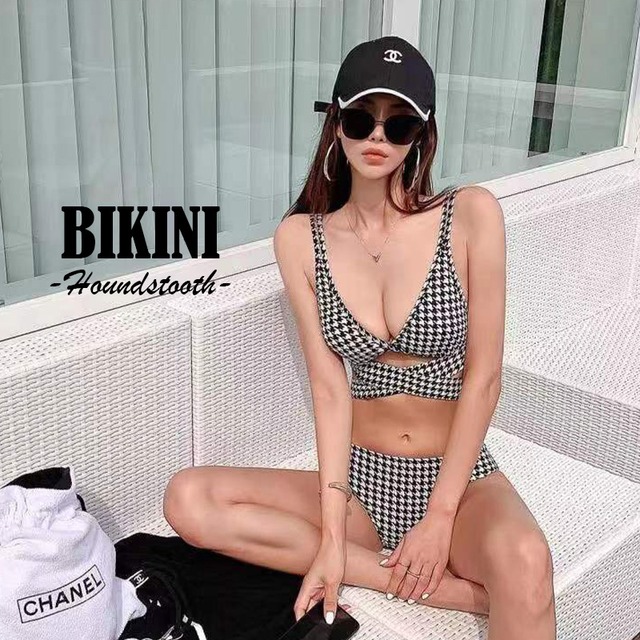千鳥格子ビキニ ウエストクロス 痩せ見え効果 美くびれ効果 ビキニ チェック柄 かわいい キュート ガーリー 映え セクシー 夏 ハイウエスト風 大人かわいい 韓国風 海 リゾート プール