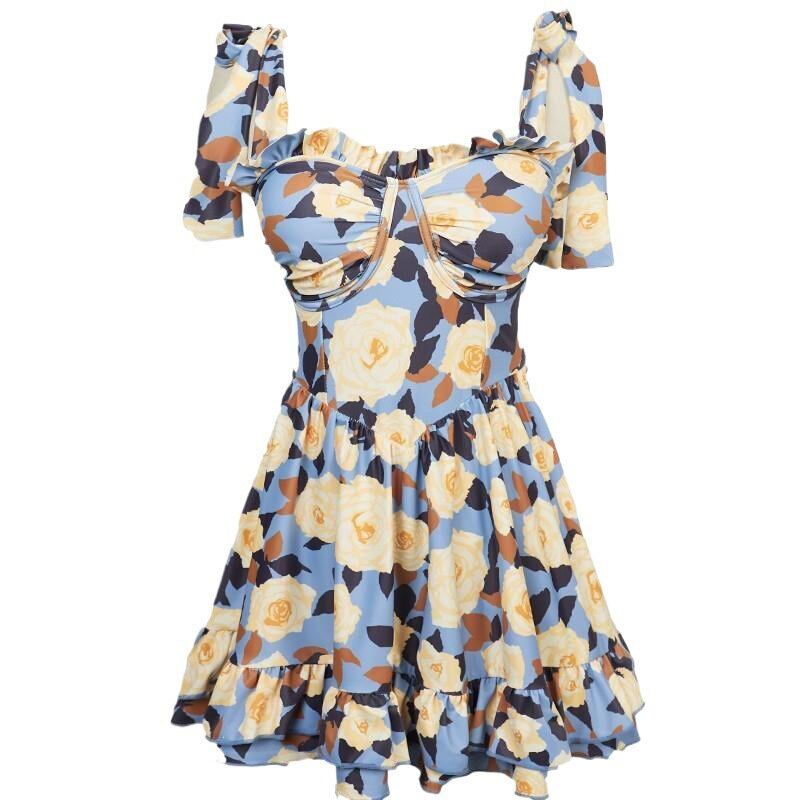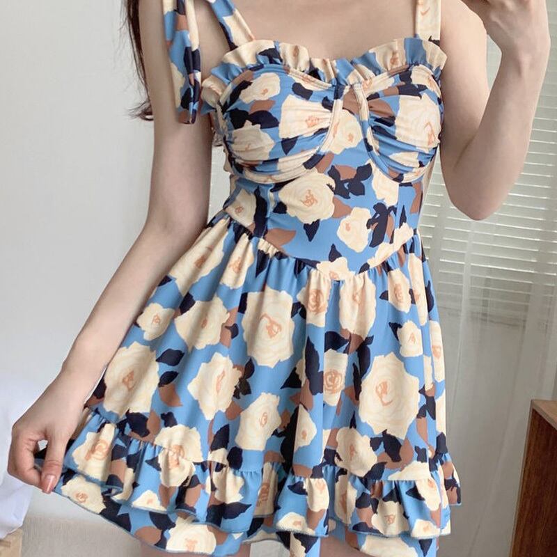 フリルワンピース水着 お花柄 フラワー ギャザー フリフリ フリル ワンピース スカート ミニワンピ 水着 背中見せ ガーリー水着 体型カバー カラフル 明るめカラー 清楚 ガーリー キュート 可愛い 大人女子 人気 プール 海 夏 映え