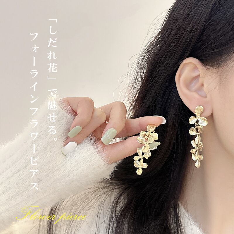 フォーラインフラワーピアス、しだれ花、大ぶり、ゴールド、揺れる、個性的、かわいい、おしゃれ、両耳セット、ファッションアクセサリー