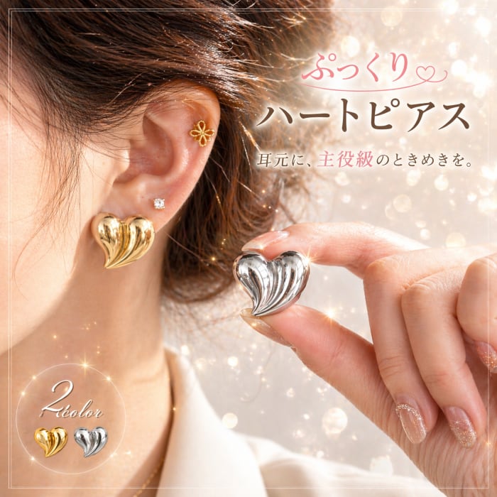 ぷっくりとした立体フォルムが印象的なハートピアス。