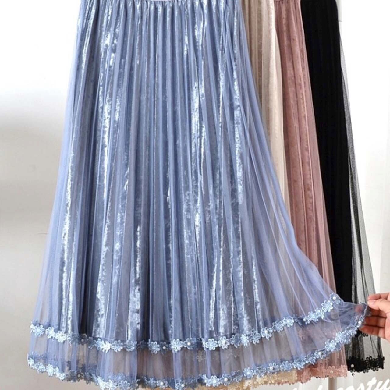マキシスカート ロングスカート 膝丈 可愛い オシャレ 黒 青 秋冬 2019 トレンド ふんわり レース