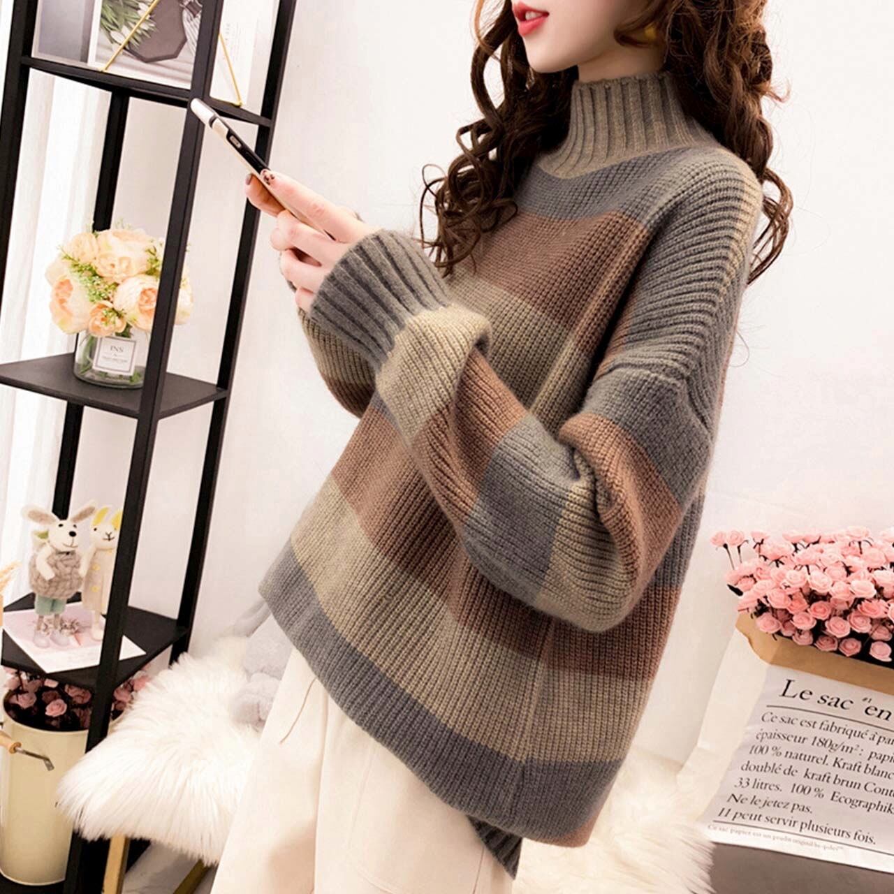 長袖 ニット セーター ボーダー ゆるふわ 暖か 白 茶色 優しげカラー 合わせやすい コーディネート