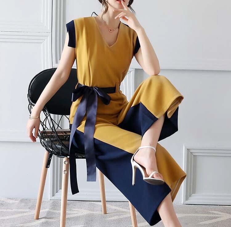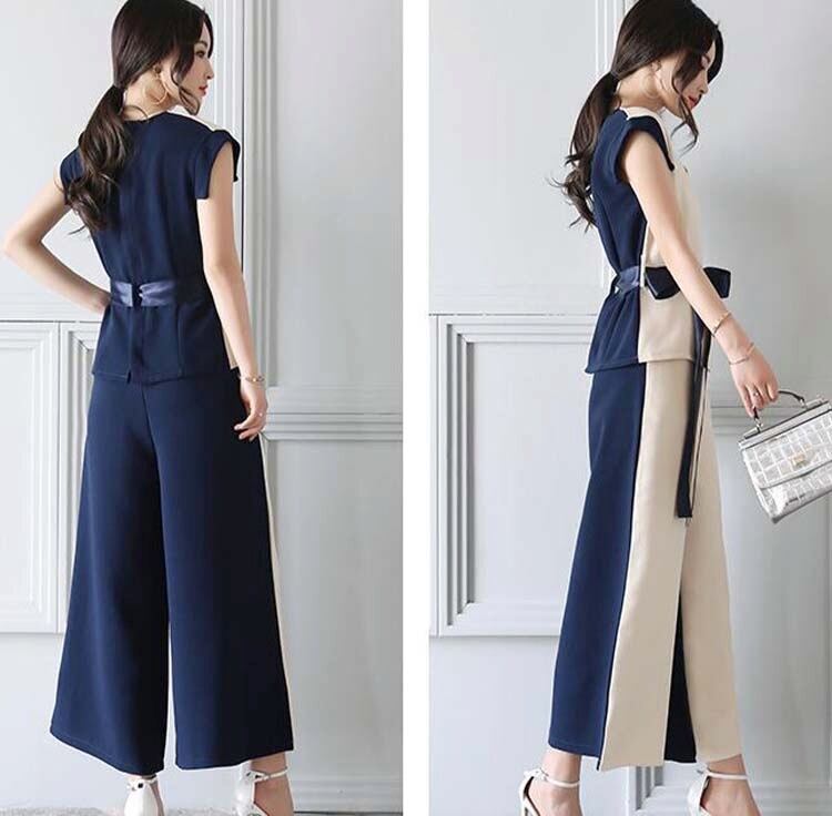 オシャレ セットアップ ワイドパンツ バイカラー エレガント 春 夏 ウエストマーク クロップドパンツ ネイビー アイボリー イエロー オフィス OL 通勤フレンチスリーブ 20代 30代 40代 50代 60代 大きいサイズあり