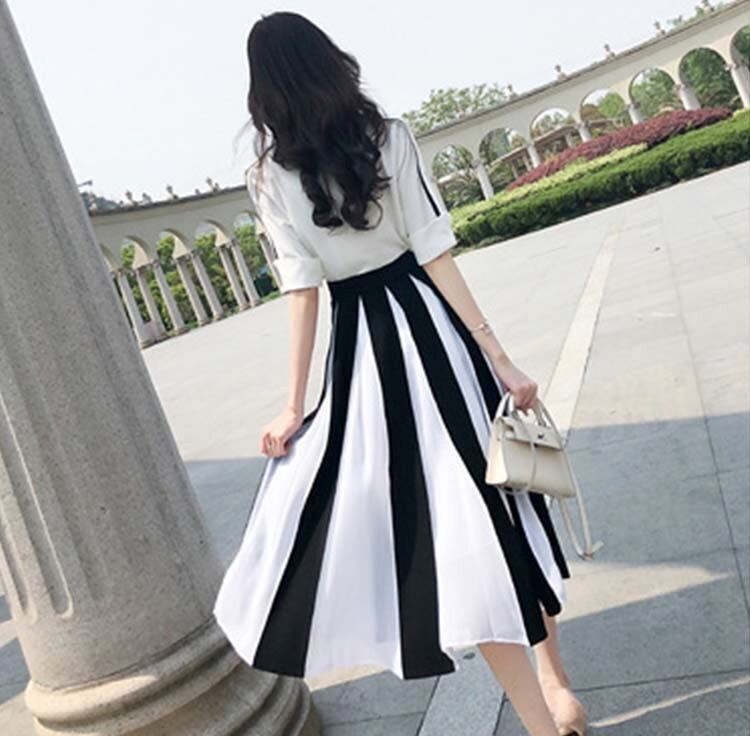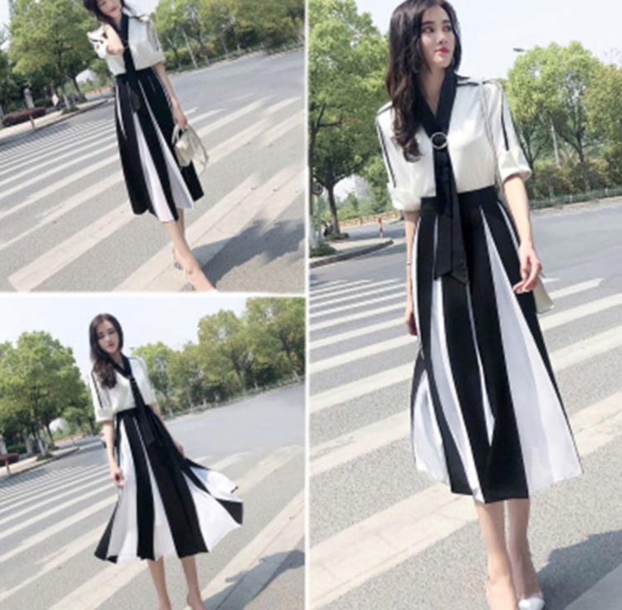 【2set】モノトーン オシャレなボウタイブラウス+フレアスカートのセットアップ