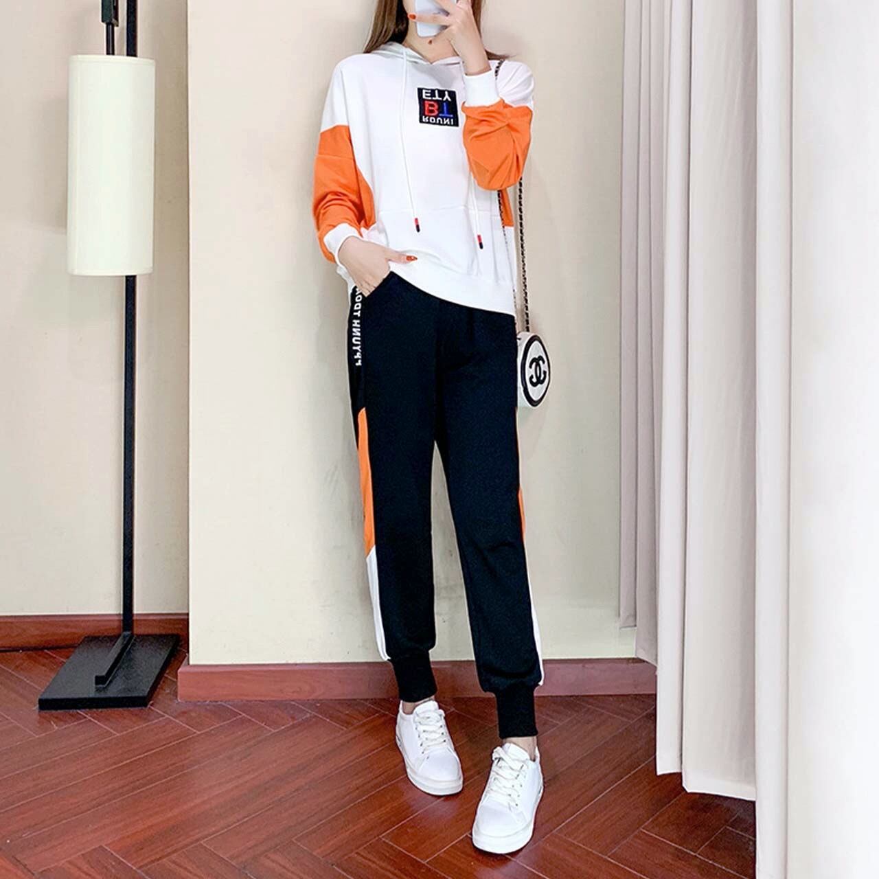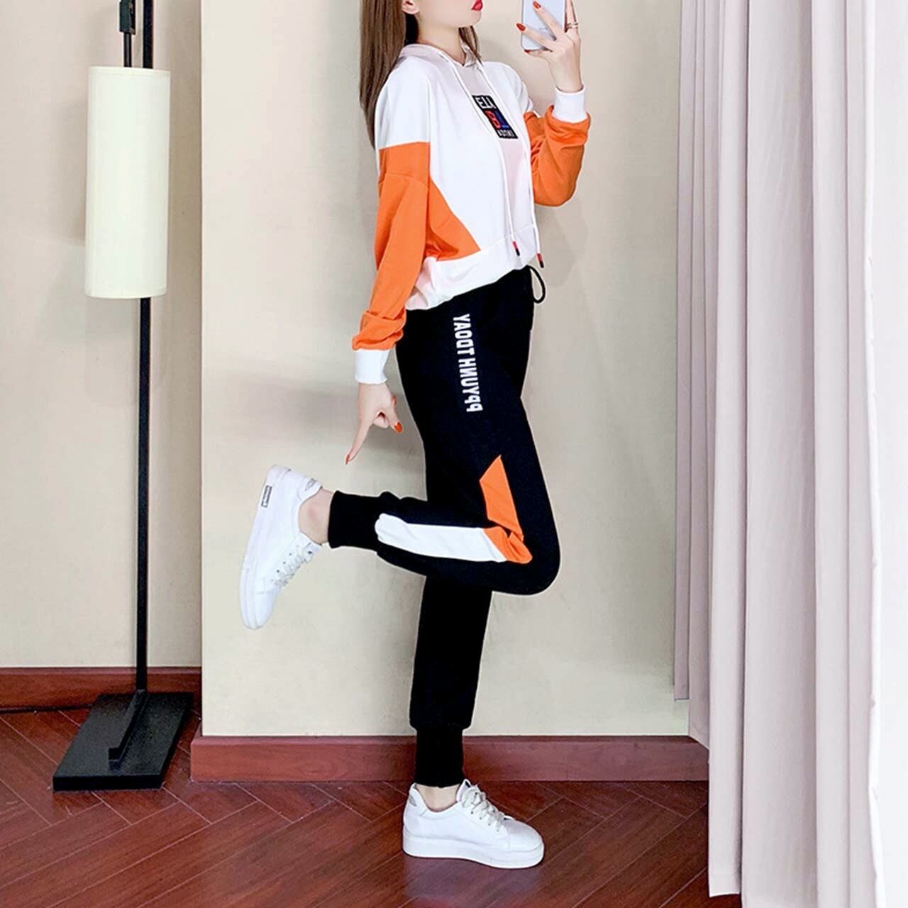 レディース ファッション セットアップ 上下2点セット お得 安い オレンジ ホワイト 白 部屋着 ジャージ パジャマ 散歩 ラフ 楽な服 女性 流行り トレンド 20代 30代 40代 50代 60代
