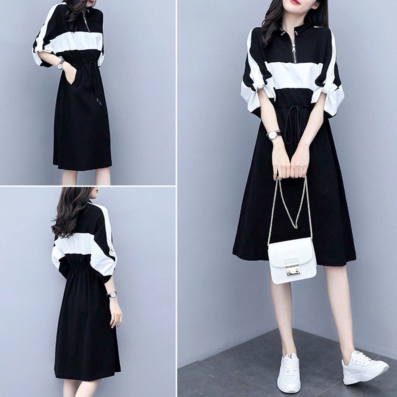 ひざ丈ワンピ ジップアップ モノトーン 五分袖 七分袖 ジッパー 可愛い