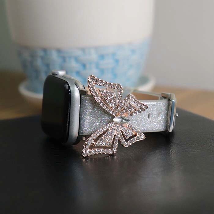 レディース 可愛い お洒落 アクセサリ 腕時計 アップル ウォッチ Apple Watch バタフライ ストーン キラキラ 光る 反射 スマートウォッチ 時計 ファッション 金具 バンド ベルト 交換 装飾 綺麗 ブラック シルバー ピンク