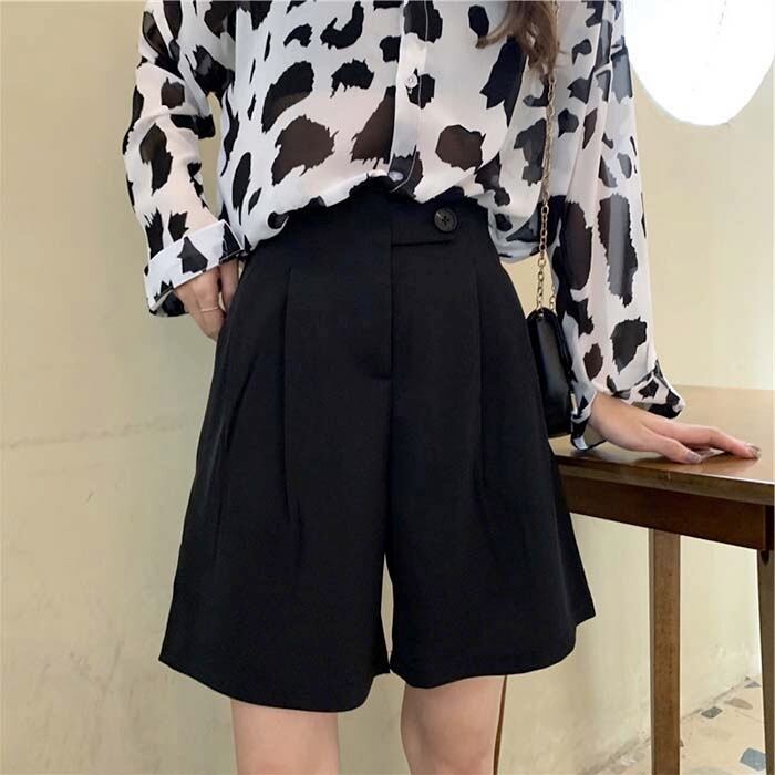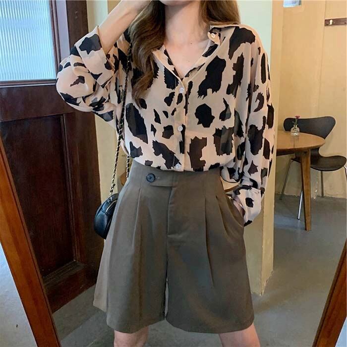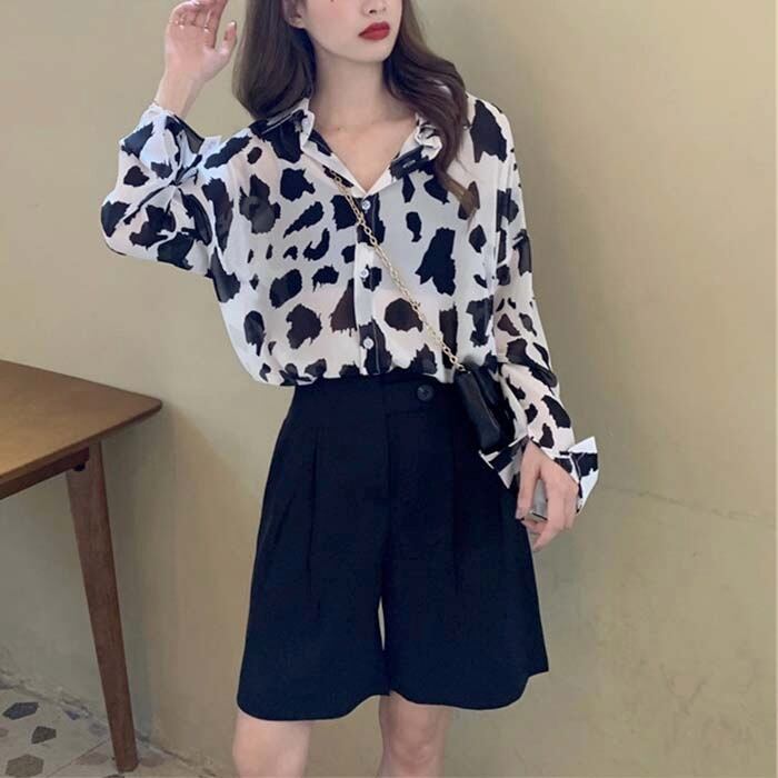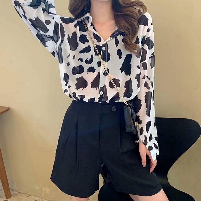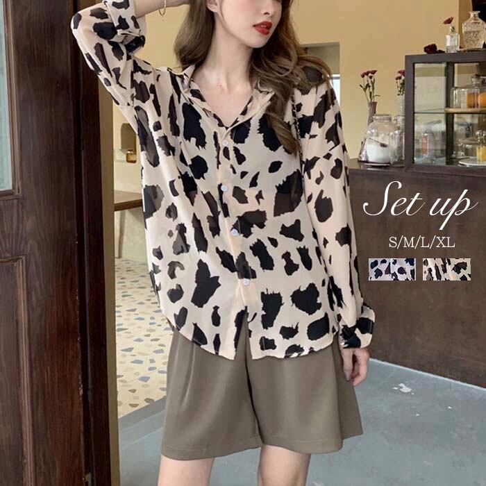 レディース ファッション 牛柄 ホルスタイン柄 シャツ ブラウス ハイウエスト ワイドレッグパンツ ハーフパンツ ショートパンツ トップス ボトムス 上下2点セット アニマル柄 ダルメシアン 白黒 ベージュ カーキ お洒落 可愛い デート お出かけ 旅行 お買い物 散歩 流行り トレンド