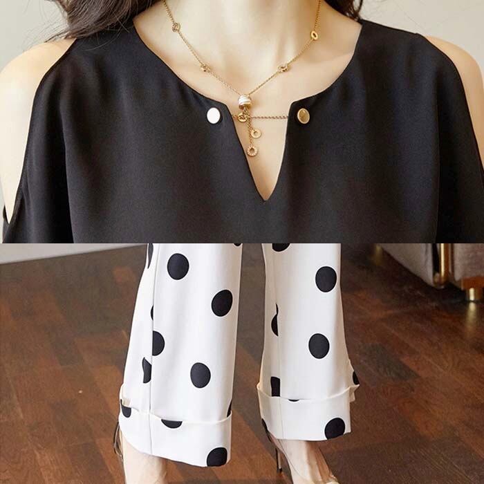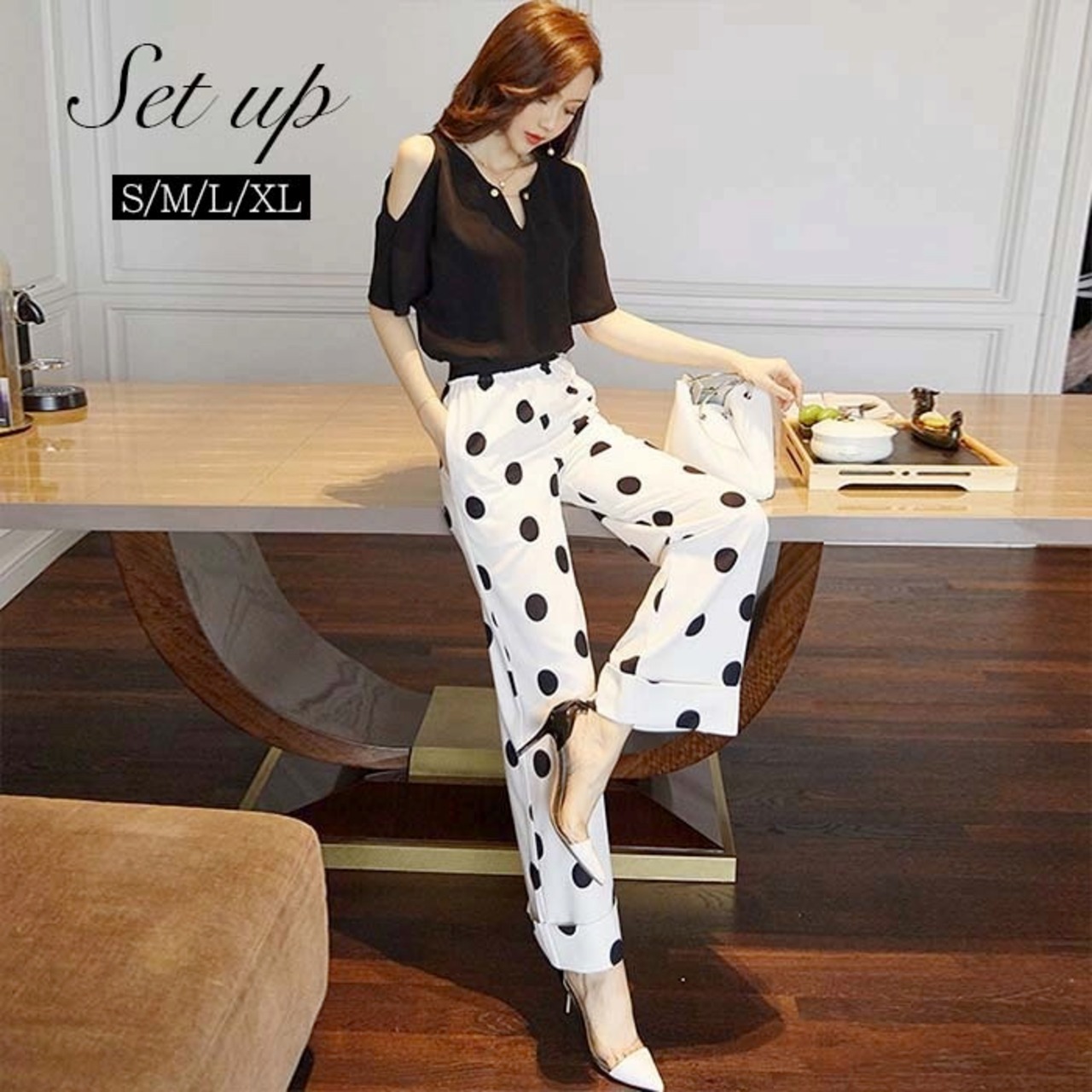 レディース ファッション シャツ シフォン ブラウス ハイウエスト ワイドレッグパンツ 長ズボン トップス ボトムス 上下2点セット 水玉 ドット柄 白黒 お洒落 可愛い デート お出かけ 旅行 お買い物 散歩 流行り トレンド モテ服