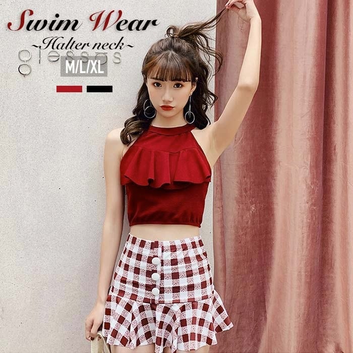 水着 ホルターネック レースアップ タンキニ 体型カバー 可愛い お洒落 フリフリ フリル ビキニ チェック 柄 ギンガムチェック ボタン 編み上げ セクシー パッド付き レディース ノンワイヤー 大人 夏 海 プール 海水浴 映え 女性 トレンド 流行り モテ水着 海外 旅行 マリン スポーツ
