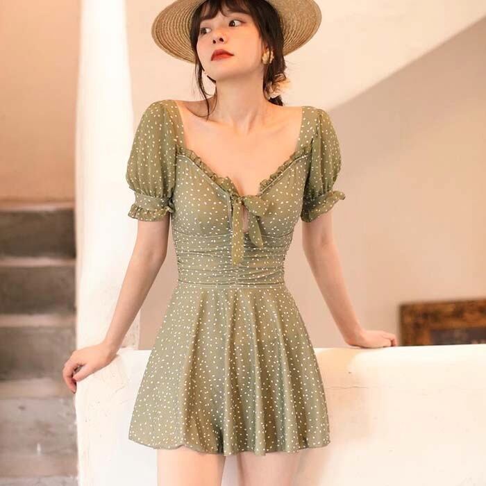 水着 可愛い レディース ワンピース レースアップ 編み上げ フリル 袖 セクシー 花びらドット 小花 フラワー オープンバック バックシャン お洒落 背中開き 体型カバー ノンワイヤー パッド付き 夏 海 プール 映え ギャザー リボン 女性 トレンド 流行り 海外 旅行 マリン スポーツ 海水浴 キュート ラブリー