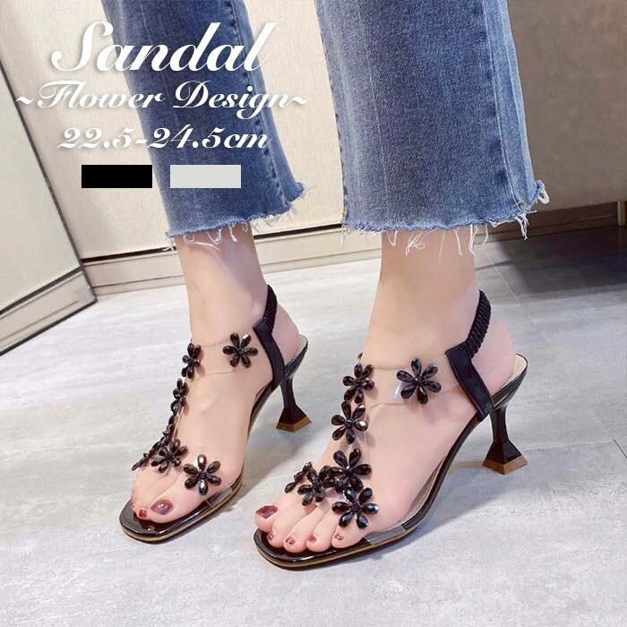 ピンヒールサンダル 歩きやすい 履きやすい 安定 お花モチーフ フラワー 女性 ガーリー キュート ラブリー 夏 22.5cm-24.5cm ヒール7cm
