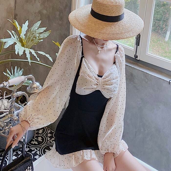 ワンピース 水着 水玉ドット 柄 可愛い レディース 長袖 パフスリーブ スカート ショートパンツ リボン フロントリボン フリフリ フリル お洒落 体型カバー 日焼け防止 対策 ノンワイヤー パッド付き スクエアネック キュート ガーリー 夏 海 プール 映え ギャザー 女性 トレンド 流行り 海外 旅行 マリン スポーツ ハワイアン 海水浴 エレガント リゾート ブラック ホワイト 黒白