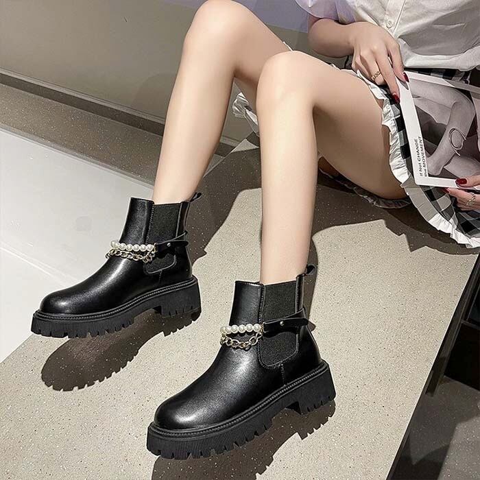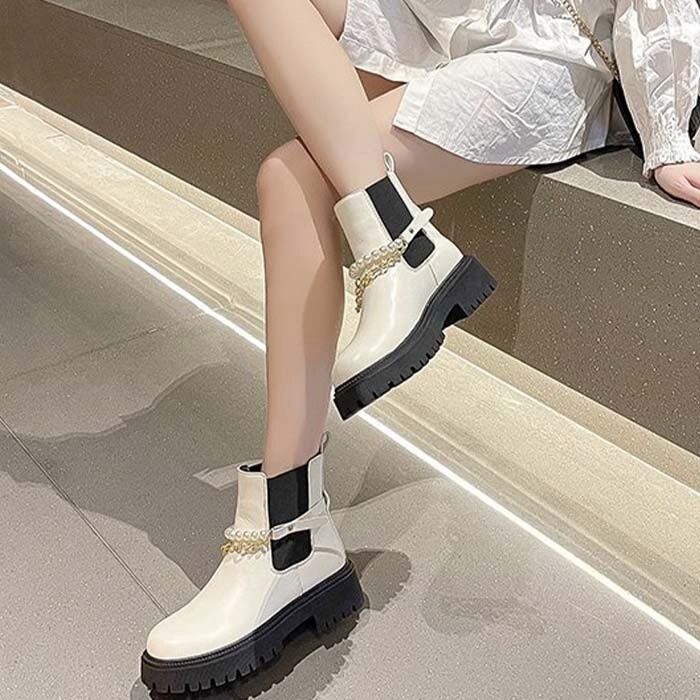 ショートブーツ パール チェーン サイドゴア ブーツ ベルト 皮革 可愛い お洒落 22.5cm-25cm
