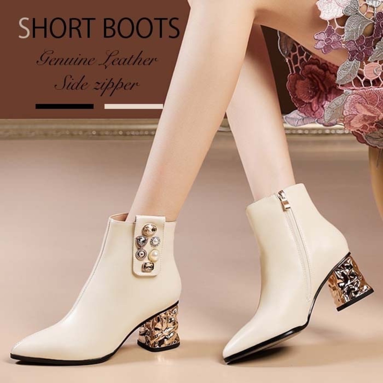 高級 本革 ショートブーツ サイドジップブーツ パール 装飾 牛革 太めヒール レザー キラキラ 上品 エレガント ジップアップ ヒール5.5cm 22cm-24.5cm