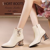 ショートブーツ 高級素材 本革 牛革 パール 装飾 レザー サイドジップブーツ デザインヒール 太めヒール チャンキーヒール 上品 お洒落 靴 可愛い ジップアップ ジッパー シューズ ヒール バックシャン ブーツ ショート ミディアム ミドル スパンコール エレガント フェミニン 流行り セレブ トレンド 綺麗 コーデ デート エレガンス サイドジッパー 春 秋 冬
