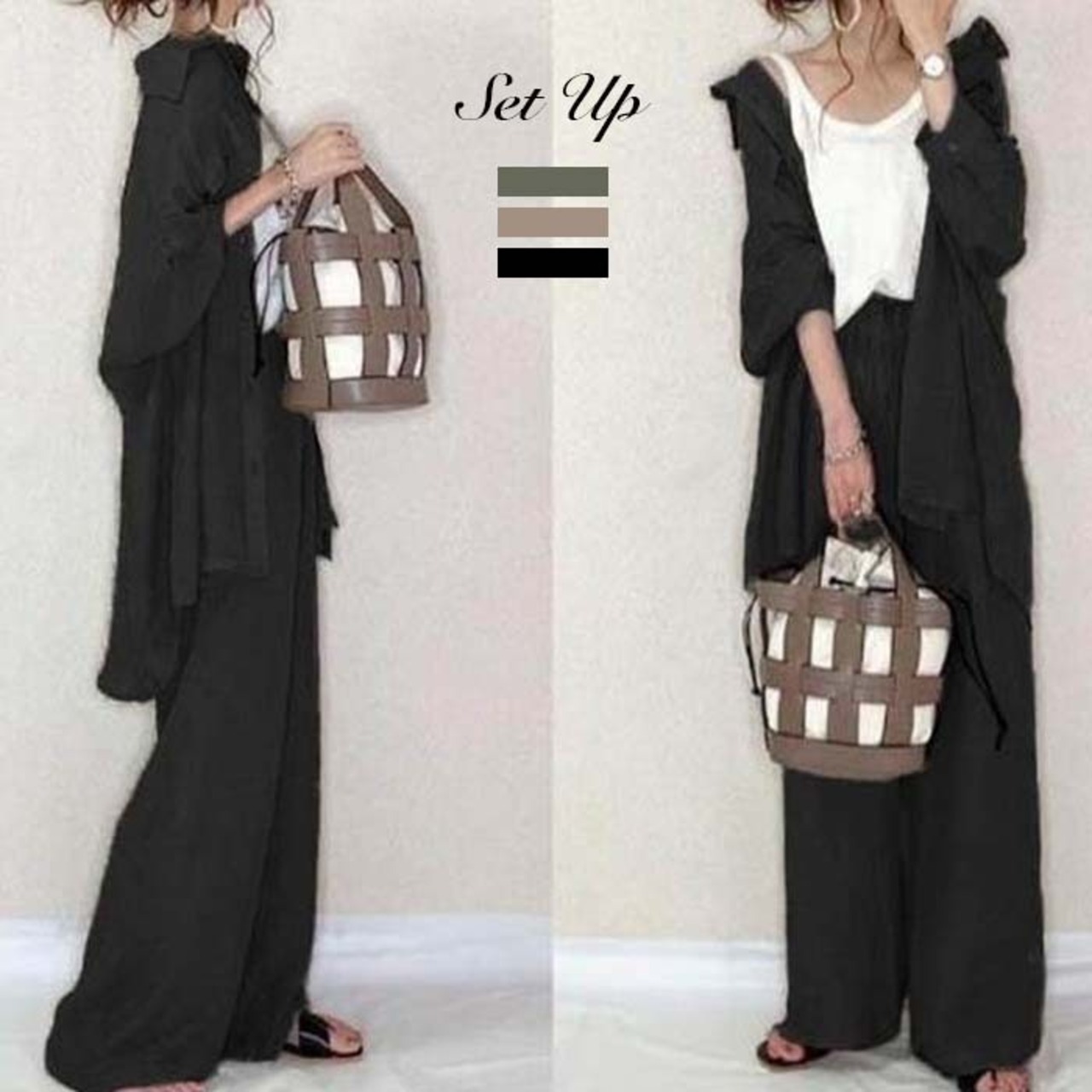 レディース ファッション 無地 シャツ ゆったり オーバーサイズ ブラウス ハイウエスト ワイドレッグパンツ 長袖 トップス ボトムス 上下2点セット ブラック ベージュ カーキ グリーン お洒落 可愛い デート お出かけ 旅行 お買い物 散歩 流行り トレンド