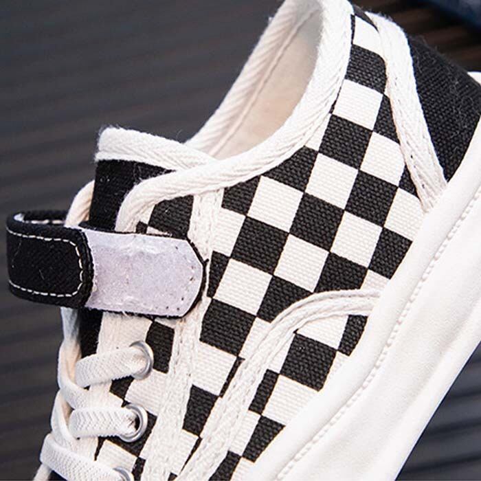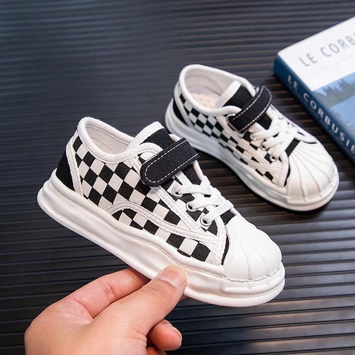キッズ 子供用 ファッション 靴 チェック柄 格子柄 白黒 モノトーン モノクロ 女の子 子供 女児 幼児 小学生 幼稚園 小学校 通園 通学 可愛い お洒落 ベビー トレンド 流行り マジックテープ 安心 安全 歩きやすい 走りやすい 軽量 軽い